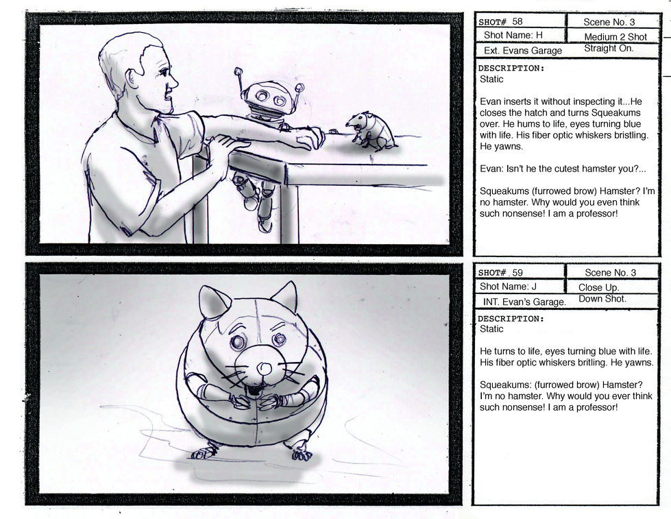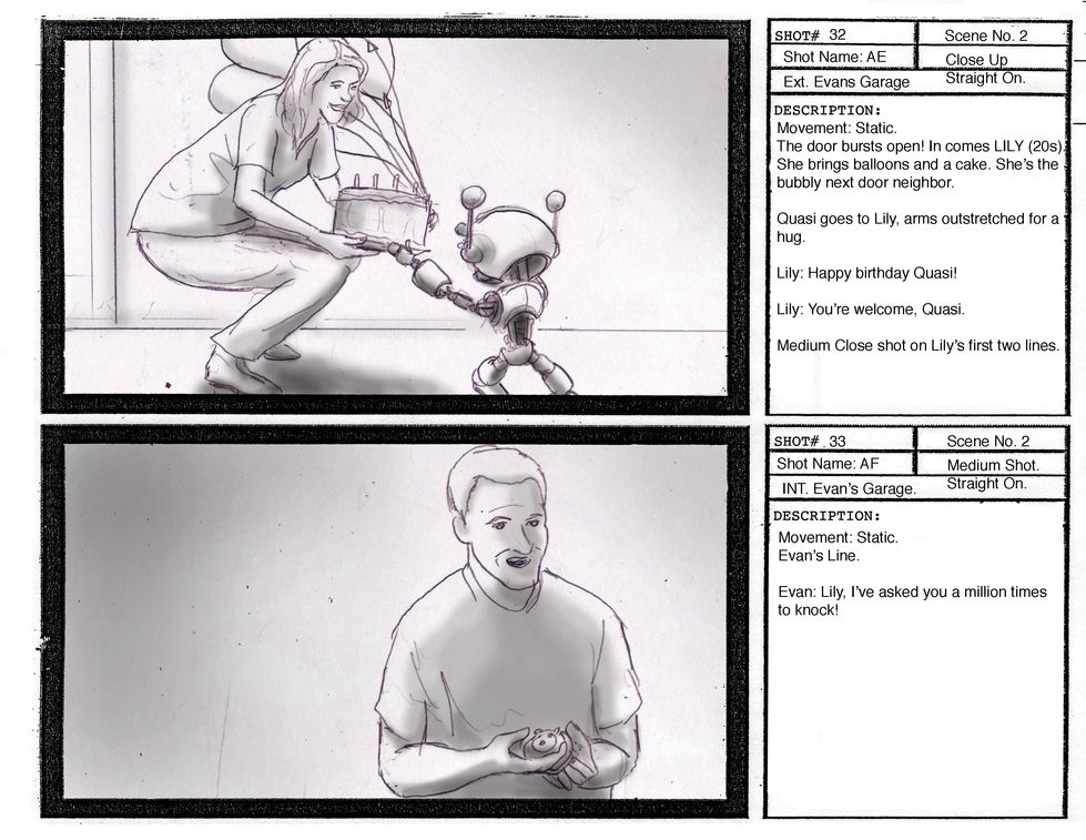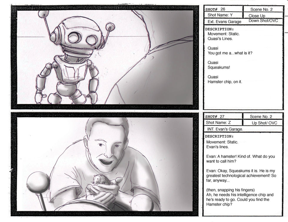 Storyboards for Quasi TV show pilot. Quasi was an an animatronic robot created by a team of students at Carnegie Mellon’s Entertainment Technology Center.